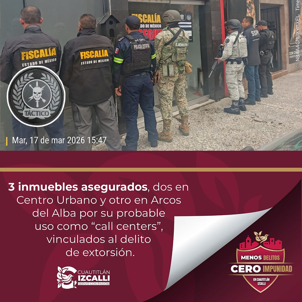 Cuautitlán Izcalli, Edomex.- Las autoridades del gobierno municipa aseguraron tres inmuebles y detuvieron a cinco personas por su probable participación en el delito de extorsión, como parte de las acciones del Operativo Desconexión.